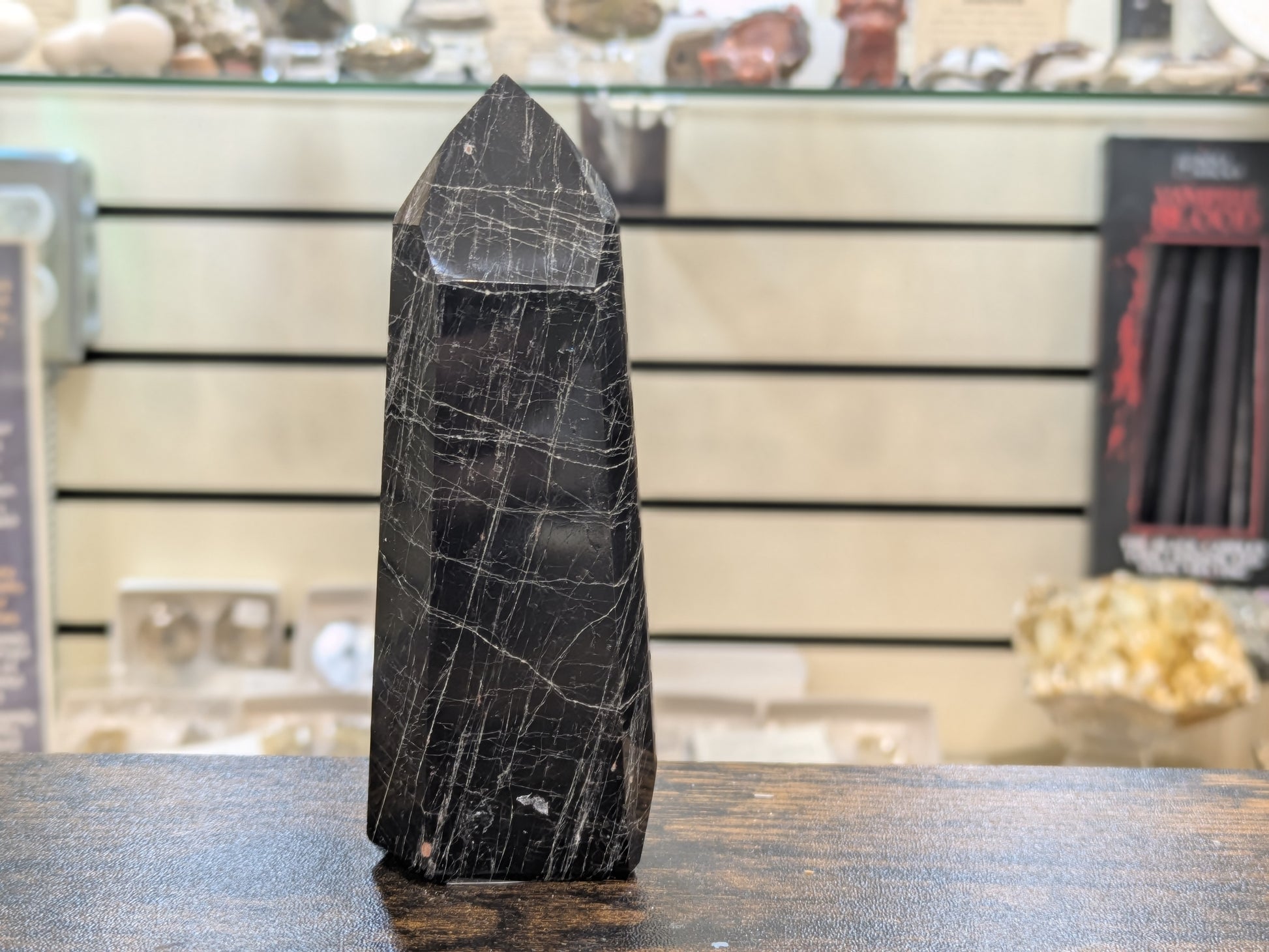 This is a listing for 1 medium Black Tourmaline crystal tower, also known as a black tourmaline point or a black tourmaline obelisk. This gorgeous point is 7 ounces and 4.7 inches tall.