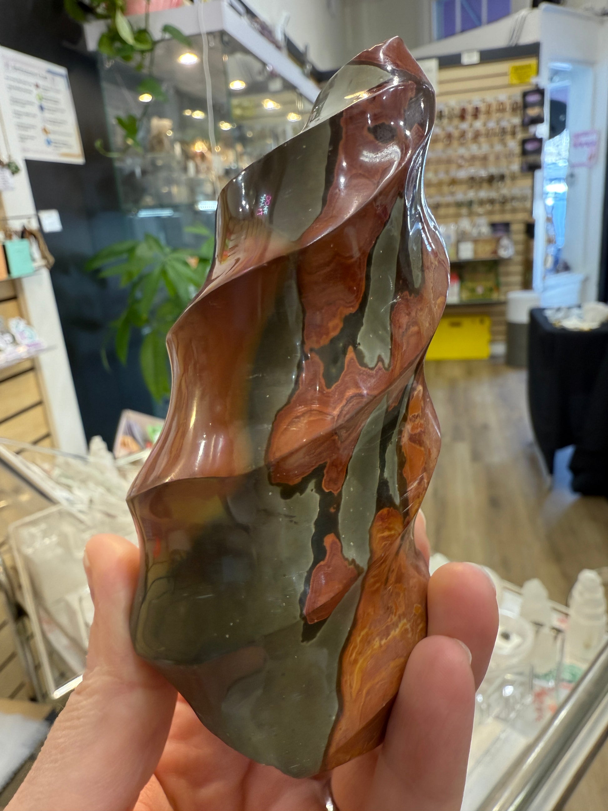 This Polychrome Jasper Flame showcases sweeping patterns of earthy reds, tans, creams, and grays, polished into a dynamic flame shape that highlights the stone’s natural movement and color banding. Also known as Desert Jasper, polychrome jasper is a chalcedony-rich jasper prized for its bold, painterly appearance.