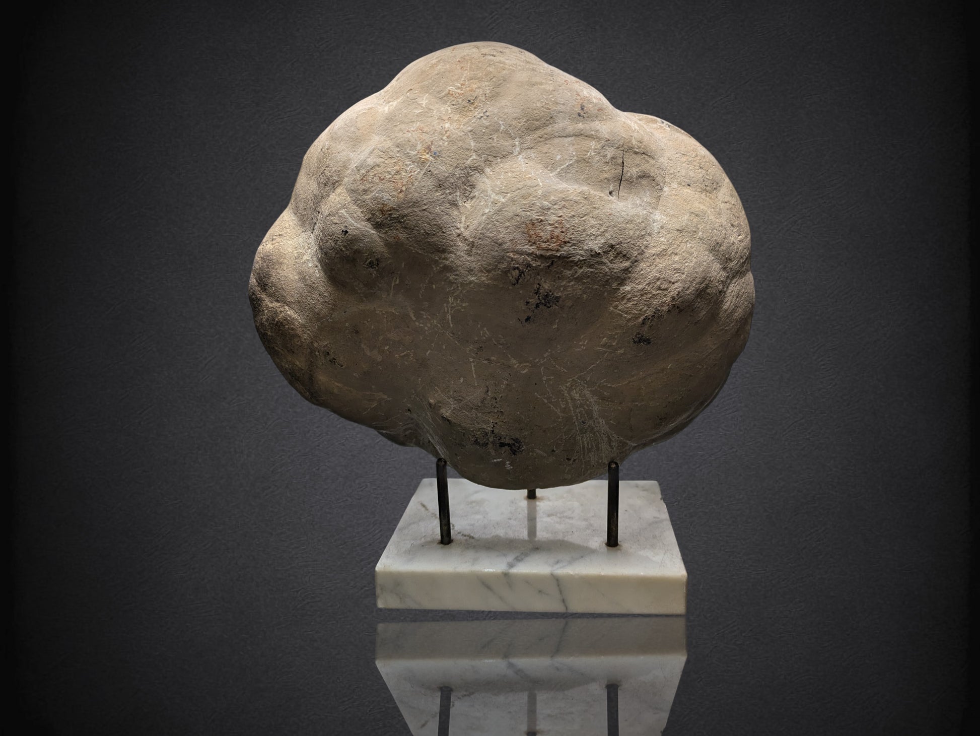 Septarian nodules are a type of concretion found all over the world. They are thought to be formed from mud that cracks due to dehydration, and calcite forms in the resulting cavity. This particular specimen is half of a nodule from Utah, and the face has been polished. More often than not, nodules are cut into slices, but in this case you get half of the giant rock! No nodule is exactly the same. The stand is included.