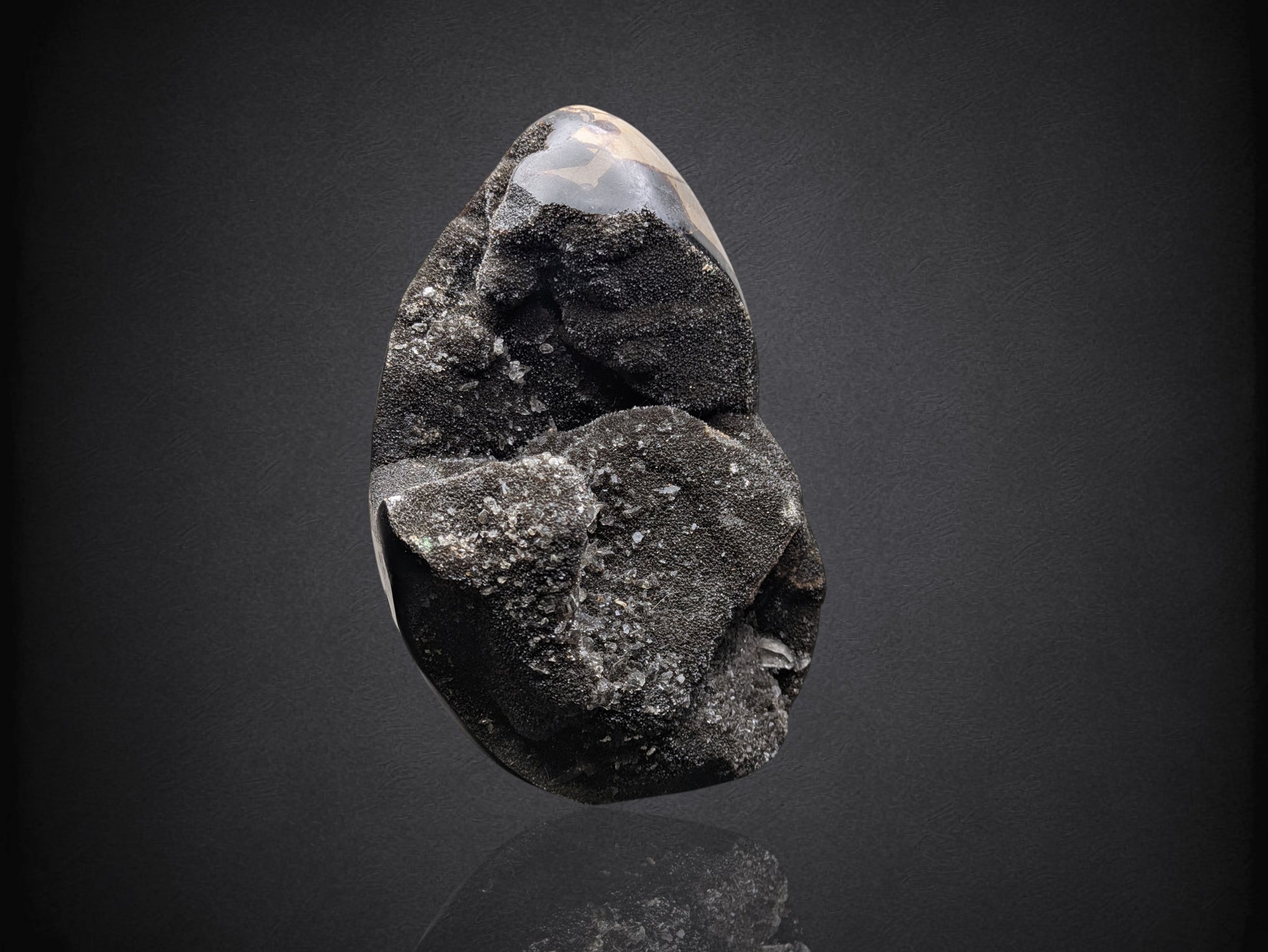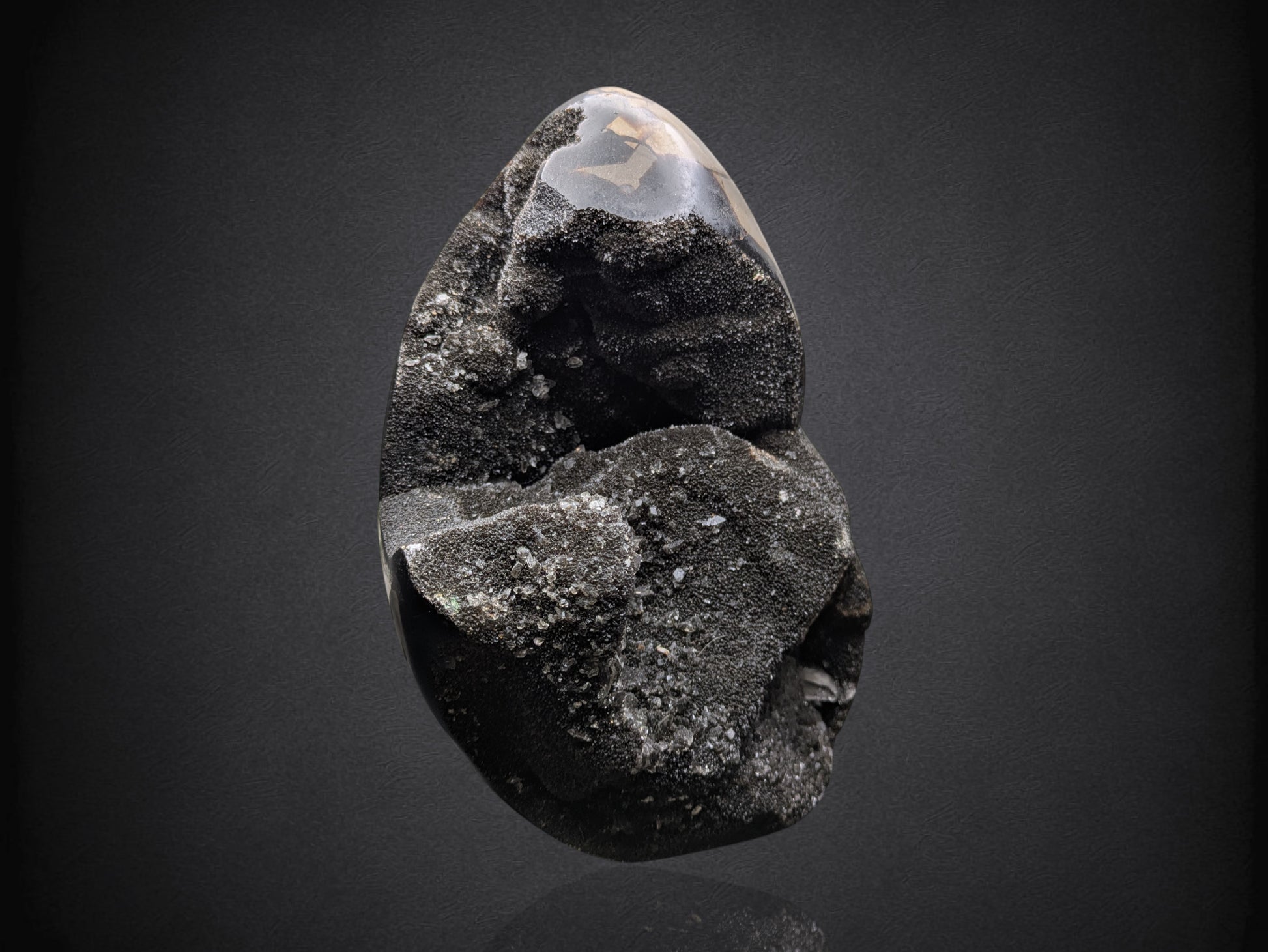Septarian nodules are a type of concretion found all over the world. They are thought to be formed from mud that cracks due to dehydration, and calcite forms in the resulting cavity. This particular specimen has been shaped from a Moroccan nodule that has been polished all the way around and has a small cut on the base allowing it to stand freely. The glittery brown calcite crystals inside are simply gorgeous.